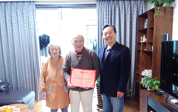 4月13日,机关三总支书记、离退休工作处处长谢宜鹏代表学校赴上海陈老家中亲切看望老人,转赠“全省离退休干部正能量活动之星”荣誉证书,并衷心祝愿老人身体健康,阖家幸福。(机关三总支)