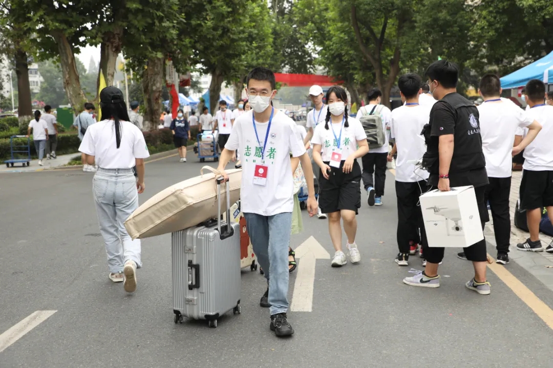 “同学,请扫码、测温后进入。”“同学,你好!请进行手部消毒。”“同学,你好!请更换口罩。”“同学,你好,我帮你拿行李。”“同学,你好!你是哪个学院的?我帮你把行李带去报到地点。”到达学校,身穿统一服装、佩戴红色胸牌的志愿者们则在北门、图书馆门口、青年志愿者岗亭等校园各个服务点,热心地为新生提供托运行李、报到指导、问题解答等全流程服务。他们分工明确、各司其职,面面俱到的服务留下无数温暖瞬间,令新生啧啧称赞。