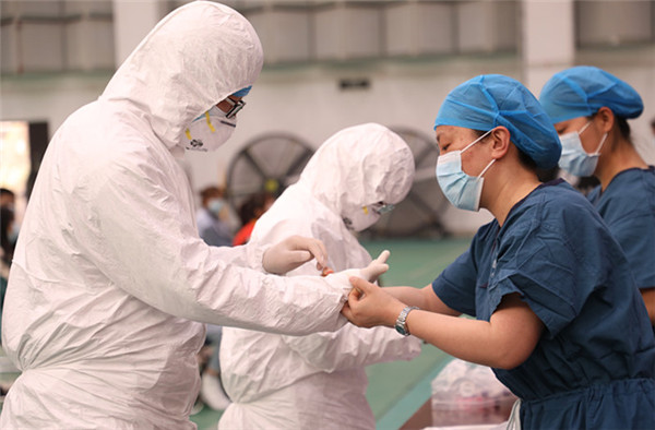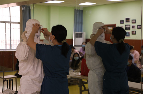 本部培训场地医护人员在给学生指导穿戴防护服的细节。程琪摄
