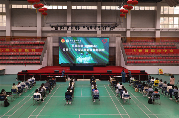 此次公共卫生专项志愿者技能培训由党委学工部、党委研工部、校团委主办,校学生会、研究生会、青年志愿者联合会承办,来自各学院的540名志愿者和卫生健康委员接受了专业技能培训。培训结束后,所有医护人员及志愿者在防护服上签名,互相留念。(朱葆珍 程琪)