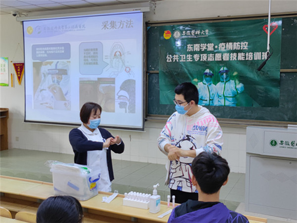 “看,同学们,头要向后仰。现在你是医生,你需要让病人配合你,而不是你来配合病人。如果病人姿势让你难以采集到样本,要记得及时纠正病人,保证自己能顺畅地采集到样本……”培训中,主讲老师向同学们详细讲解了七步洗手法、咽拭子采集法、穿脱防护服等工作的具体细节。