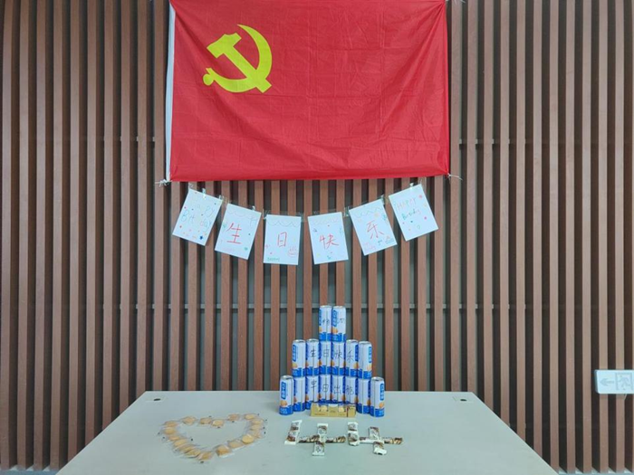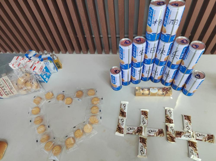 完成手头工作间隙,我们的“大白”护士孟梦、黄菊和陈艳艳化身手工达人,有人用借来的舱内小朋友的画笔画着色彩斑斓的生日卡,有人在饮料包装上书写着生日祝福语,有人精心布置着生日台面。条件有限订不到生日蛋糕,护理八组成员们就自发地把自己出发时携带的零食带过来,摆出了好看的造型。