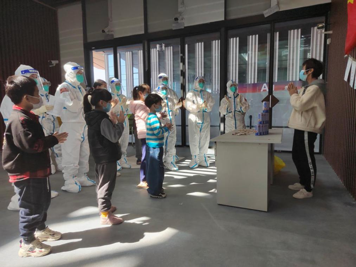 “大白们”忙碌布置时,吸引了许多舱里患者的围观,尤其是几个小朋友,大家纷纷好奇地问:“今天你们医生谁过生日啊?”大白们笑而不语。