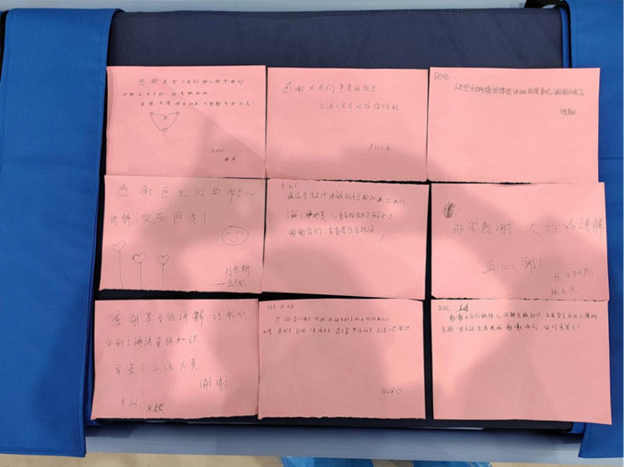 舱内患者对此次“急救科普小讲座”给予了高度的认可。讲座结束后大家在纸条上留言:这个“小课堂”的内容科学又实用,真的是上了一堂“生命”的必修课!