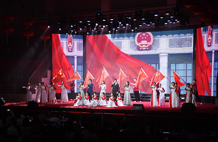 该校师生表演节目《党旗飘扬的方向》。殷泽文摄