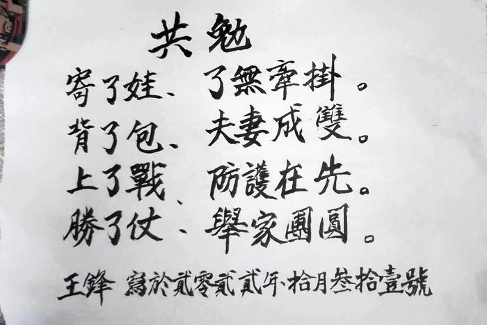 中新网合肥11月2日电 (吴晓珍 付艳 张强)“寄了娃,了无牵挂。背了包,夫妻成双。上战场,防护在先。打胜仗,举家团圆。”这是詹小林的妻子与儿子创作的一首诗。