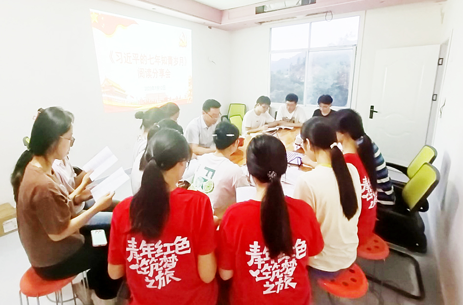 实践期间,每当夜晚来临,在团队思政指导教师张博和辅导员朱茂宗的组织下,团队成员们都会聚到岳西县皖源村党群服务中心会议室,灯光下,大家围着小桌共同开展理论学习,分享阅读感受。每日的分享交流,引导着青年学子们真学、真懂、真信、真用。