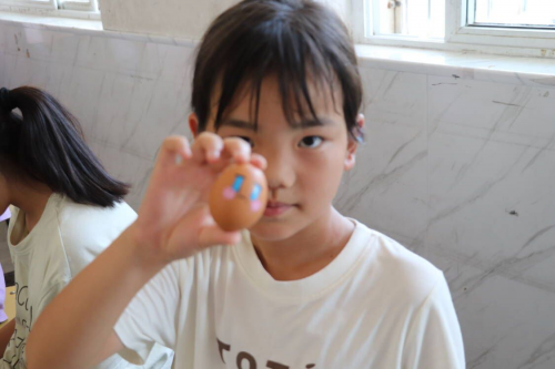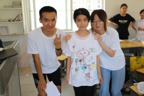 下午3点,志愿者李京、李晓和张子玥带领同学们展开了一门别开生面的新课堂,孩子们在鸡蛋、白纸和T恤上尽情发挥自己的想象,或画意盎然,或浮想联翩,又或梦笔生花。孩子们稚嫩的画笔,勾勒出他们此时的心境,课堂上充满了欢声笑语。提前完成绘制的小朋友们已经迫不及待地穿上“新衣”,志愿者郑雨泽为小朋友们合影留念。“这次的绘画课很有意思,老师们在身旁一直鼓励我,能够和老师们一起画这幅画很开心,谢谢老师们的帮忙。”课程很快在欢乐的氛围中结束了,同学们向老师挥着手,在家长的带领下就此分别。