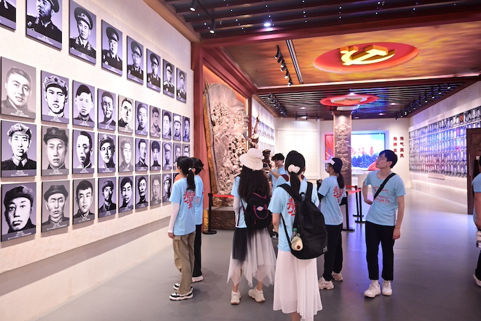 在金寨县革命烈士纪念塔前,团队成员们整齐列队,依次献上白菊,默哀肃立,行三鞠躬礼,以此表达对革命英烈的深切缅怀和崇高敬意。革命博物馆内,实践团成员配合安徽师范大学地理旅游学院志愿者的宣传讲解,结合馆内丰富的文物和史料,共同回顾了革命先辈的烽火岁月,重温了中国共产党人的爱国初心、壮志情怀和革命精神。追随着习近平总书记的足迹,实践团一路汲取养分、笃行不怠,用脚步追寻红色印记,用内心感应时代脉搏。“我们可能没办法完全记住先辈们的名字,但是我们永远不会忘记他们是‘革命英雄’的一员。作为后辈,我们会将革命精神传承发扬,为推进中国式现代化中贡献自己的那份光与热。”参观结束后,团队负责人彭槿同学坚定地说道。