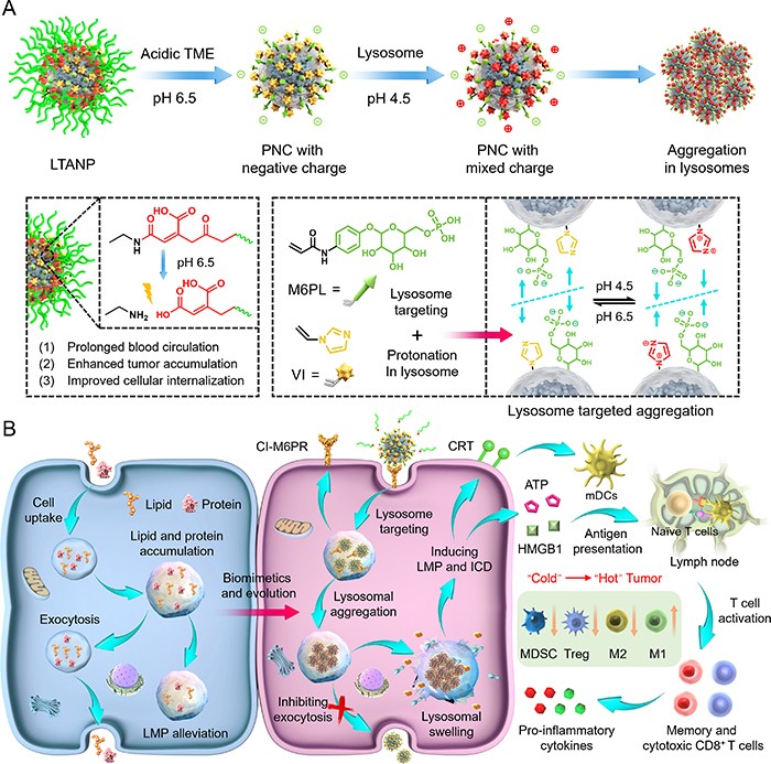 纳米技术已在临床实践中证明了其巨大的应用价值。然而,目前对纳米药物的研究仍然主要集中在开发纳米颗粒作为递送载体,以最大限度地提高负载药物的生物利用度,却很少探索它们直接调节生理过程的潜力。受未降解物质过度积累引起的溶酶体肿胀启发,该项研究中,研究人员提出了一种用于癌症治疗的溶酶体靶向聚集性纳米颗粒(LTANP)。