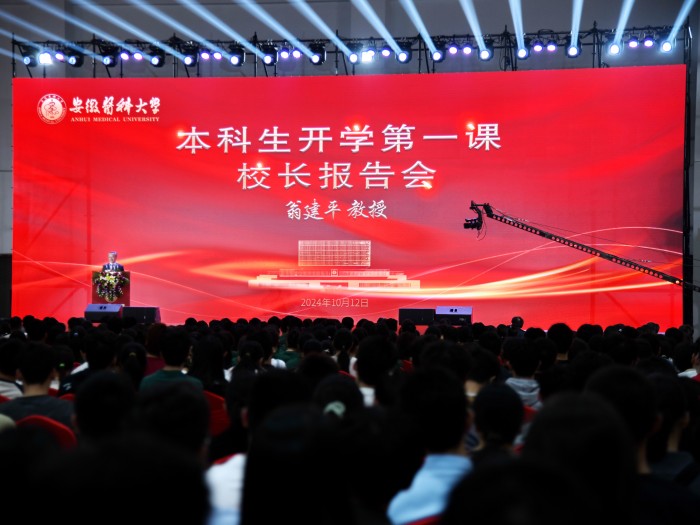 10月12日晚上,新医科中心(新校区)体育馆内,校长翁建平以《立志明德,筑梦启航 努力成为有理想、敢担当的新时代大国良医》为题,为2024级本科生新生讲授“开学第一课”,勉励同学们立足时代要求,立鸿鹄之志,成大国良医,为人民健康保驾护航。