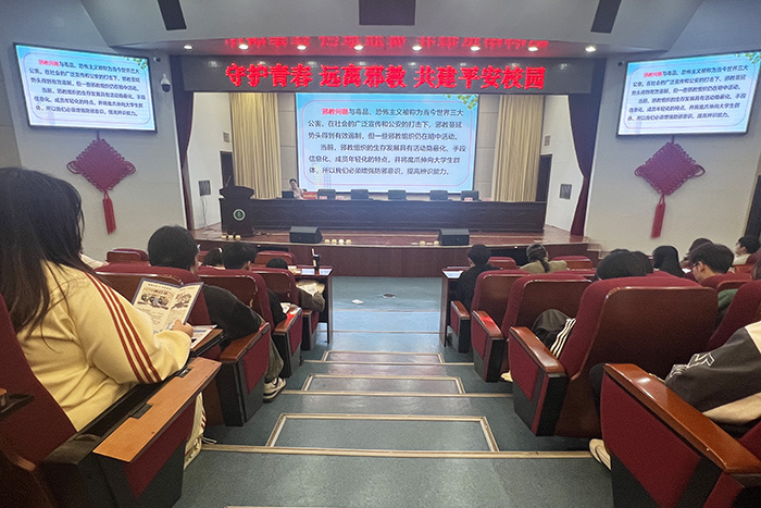 反邪教安全知识专题讲座中,“阳光家园”宣讲团成员围绕“守护青春 远离邪教 共建平安校园”的主题,对邪教的定义、传播手段、危害性以及防范措施等内容进行了深入浅出的讲解。讲座内容丰富、条理清晰,既有理论阐述,又有案例分析,现场师生纷纷表示受益匪浅。答题环节将所讲授知识融入题目,考察学生对反邪教知识的掌握情况,参与同学踊跃举手作答,现场气氛热烈。