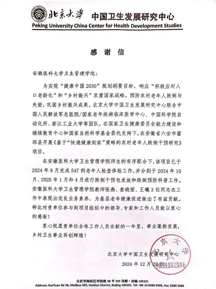 信中表示,卫生管理学院自2024年8月以来,积极参与国家自然科学基金项目《基于“快递到家”策略的农村老年人跌倒干预研究》的实施,展现了专业团队扎实的业务能力。在项目的现场实施过程中,学院多位老师带领研究生、本科生积极参与现场工作,充分发挥了教学与实践相结合的优势,在项目的顺利推进中发挥了重要作用。在团队的共同努力下,项目为农村老年群体的跌倒预防提供了科学有效、切实可行的解决方案。北京大学中国卫生发展研究中心对该院师生展现的专业素养和敬业精神表示由衷的感谢。