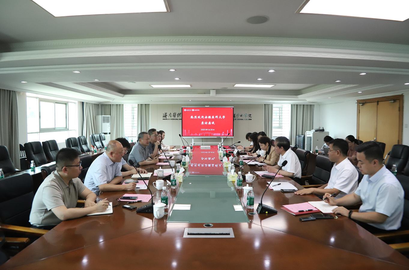 5月26日,校长翁建平率队前往海南医科大学开展调研交流。海南医科大学党委书记张彩虹、校长陈国强出席座谈会。