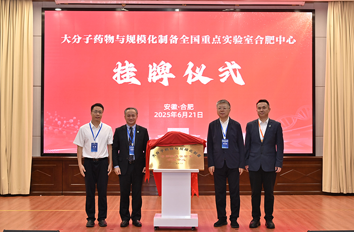 6 月 21 日,药学科学学院成立大会暨大分子药物及规模化制备全国重点实验室合肥中心挂牌仪式在梅山路校区图书馆学术报告厅举行。哈尔滨医科大学杨宝峰教授,温州医科大学校长李校堃教授,省教育厅、省科技厅相关部门负责人受邀出席大会。校党委书记王琦、校长翁建平,校党委常委、副校长吕雄文出席,学术副校长黄志锋主持大会。校党委常委秦楠、李震静,徐叔云讲席教授魏伟参加活动。
