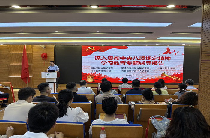7月2日上午,国际学院、继续教育学院、教务处(实验教学中心)、社会合作处、教育质量评估中心等五个单位,联合举办深入贯彻中央八项规定精神学习教育专题辅导报告会。国际学院直属党支部书记黄华兴,继续教育学院直属党支部书记、院长刘从云分别主持报告会。马克思主义学院院长柳泽民教授受邀作专题辅导报告。
