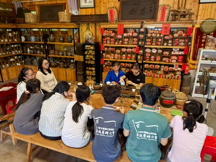 实践活动期间,团队成员参观了国家级非遗祁门傩舞传习所、国家级非遗祁门红茶手工坊,近距离感受当地“非遗的美学魅力,还就当地康养产业现状、居民健康情况展开问卷调查,并向村民们宣传了健康卫生知识。团队成员、2023级运动康复系学生张蕾表示:“非遗蕴含着丰富的美育资源,此次活动让大家在感知、体验中深入了解了更多的中华优秀传统文化,也陶冶了高尚情操。作为医学院校大学生,我们要积极传播安茶的康养价值,为健康中国建设贡献青春力量。