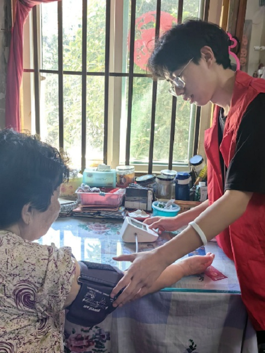 7月4日晨光微熹,梅山路社区已响起轻快的敲门声。“青禾”队员们带着血压计和暖心物资走进社区里一户户老人家中。90岁的万奶奶手腕上缠绕着血压带,志愿者小同一边测量一边柔声细语:“奶奶,咱们以后炒菜少放半勺盐好不好?”在张大爷家,一句“咳嗽久了也要当心结核病”的提醒,让老人恍然大悟,拍腿称是。当正午阳光爬上窗台,居民们攥着图文手册送到楼道口,志愿者们汗湿的后背与居民挥动的手臂,在蝉鸣声中织就一幅“民呼我应”的温情画卷。