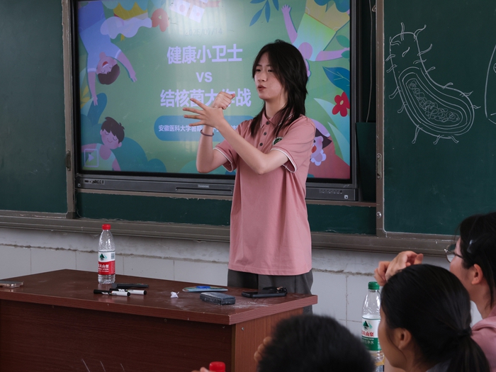 在黄泊渡村小学的教室里,一场别开生面的肺结核防治宣讲课正在进行。实践团的志愿者们化身“健康小老师”,结合小学生的认知特点,精心准备了图文并茂的幻灯片、生动有趣的动画短片和互动问答。志愿者们用通俗易懂的语言向孩子们讲解了肺结核的传播途径、主要症状以及预防方法。“同学们,咳嗽、打喷嚏时要用纸巾捂住口鼻,这不仅是礼貌,更是预防肺结核的重要方法哦。”亲切又有感染力的话语让孩子们听得聚精会神,大家也纷纷举手提问、积极互动,课堂气氛十分活跃。